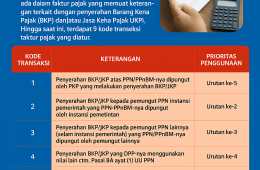 Kode transaksi merupakan bagian yang harus ada dalam faktur pajak yang memuat keterangan terkait dengan penyerahan barang kena pajak (BKP) dan/atau jasa kena pajak (JKP). Hingga saat ini, terdapat 9 kode transaksi faktur pajak yang diatur